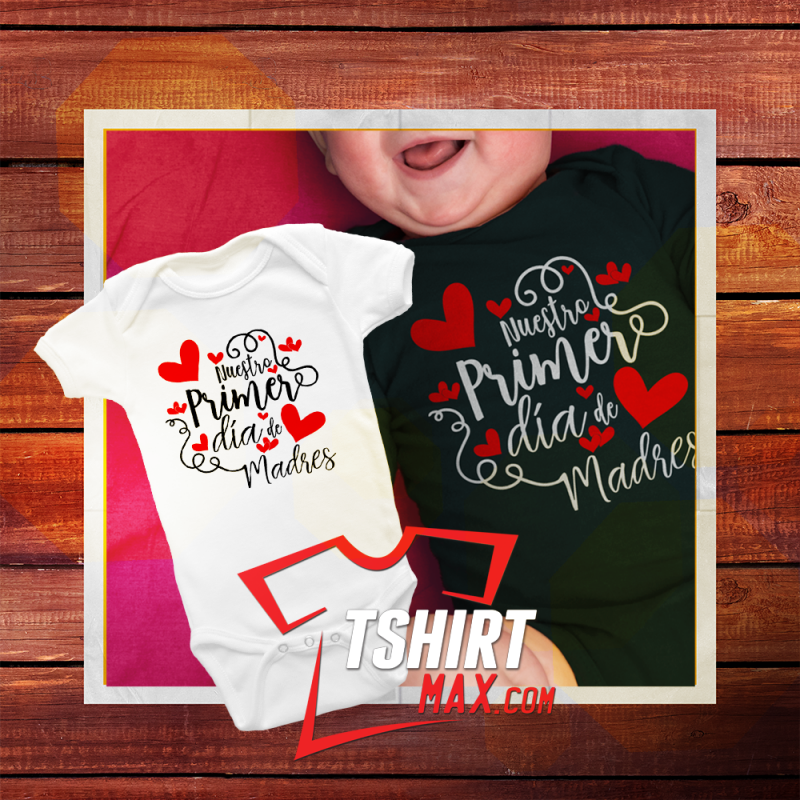 "Nuestro Primer Día De Las Madres V2" diseño original en Blanco/Rojo ó Negro/Rojo. Bodysuit Blanca ó Negra 100% Algodón - Tamaños Disponibles: NewBorn, 6 meses, 12 meses, 18 meses, 24 meses, camisitas 2T ó 3T y también puede escoger en tshirts de niños.