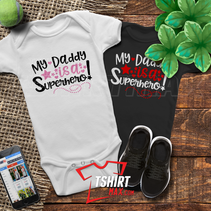 "Dad is my Superheroe" diseño original en Blanco/Negro y Amarillo. Bodysuit Blanca ó Negra 100% Algodón - Tamaños Disponibles: NewBorn, 6 meses, 12 meses, 18 meses, 24 meses, camisitas 2T ó 3T y también puede escoger en tshirts de niños.