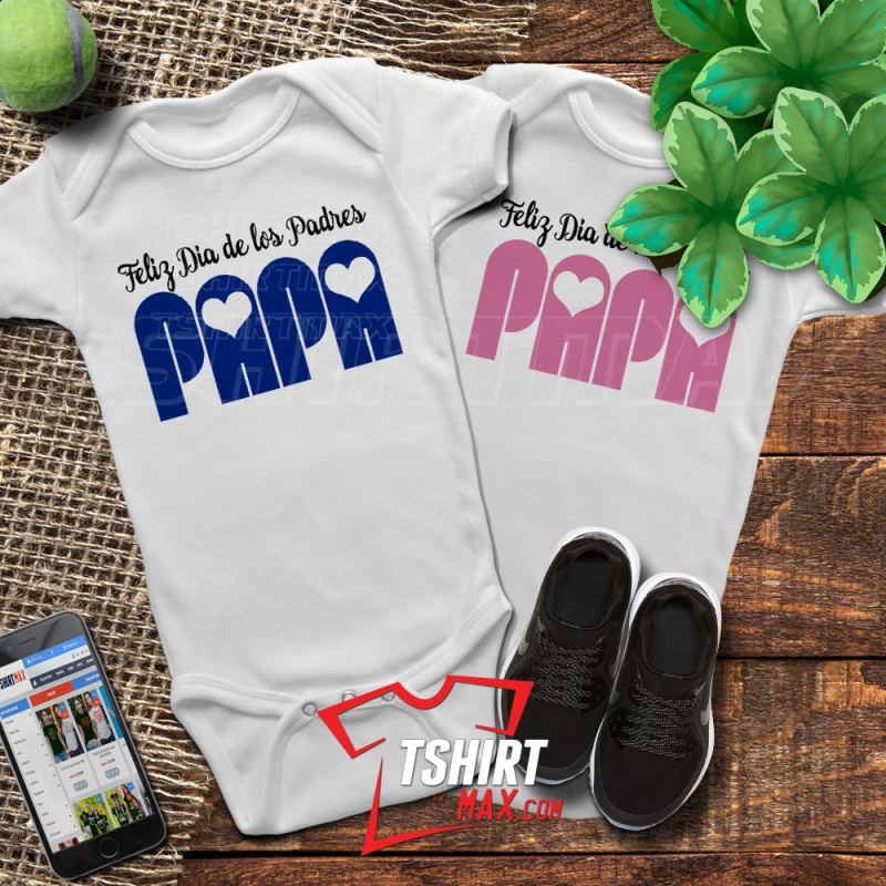 "Feliz Dia De Los Padres PAPA" diseño original en Negro y Royal/Rosa. Bodysuit Blanca ó Negra 100% Algodón - Tamaños Disponibles: NewBorn, 6 meses, 12 meses, 18 meses, 24 meses, camisitas 2T ó 3T y también puede escoger en tshirts de niños.
