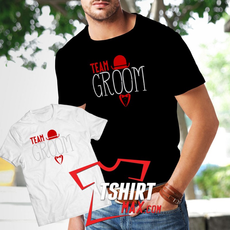"Team Groom"! Diseño original en Rojo y Blanco - Tshirt Negra/Blanca marca Jerzees/Gildan para Chico..