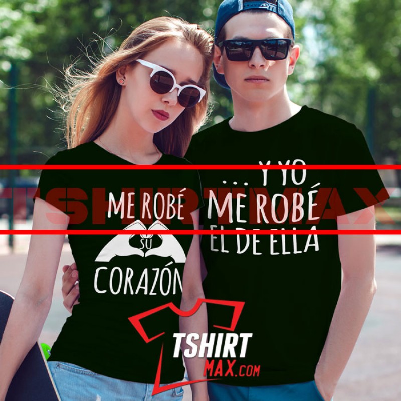 Me Robe Su Corazon - Y Yo El De Ella" diseño original en Blanco/Negro - Tshirt Negra Next Level 60% / 40% para Chicas y Tshirt marca Jerzees/Gildan (dependiendo disponibilidad al momento) Ojo CHICAS: las Next Level corren ajustadas.. si quieres que te queden sueltas te recomendamos una talla más.