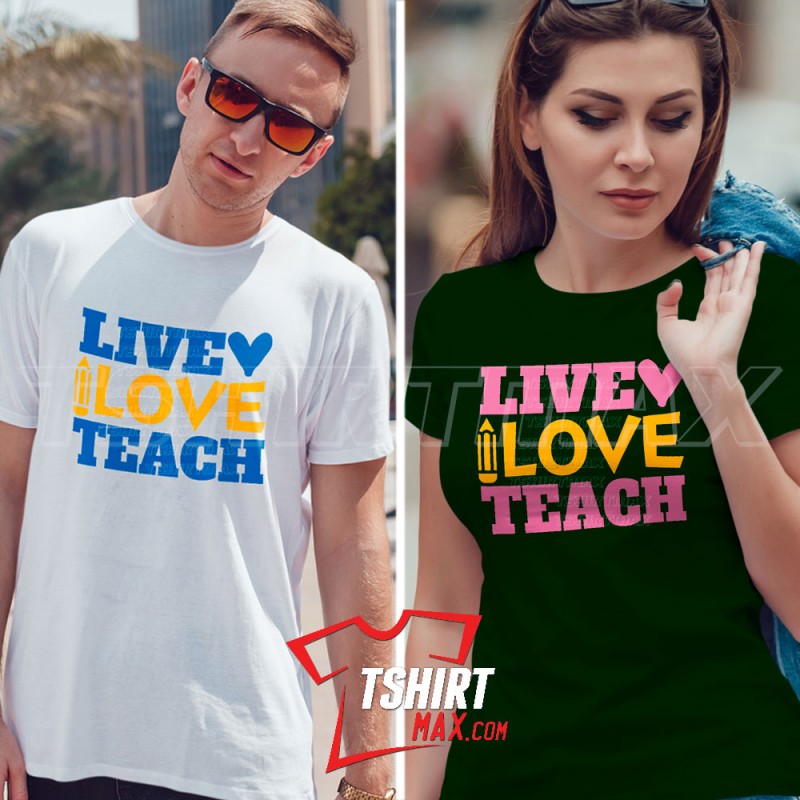 "Live Love Teach" diseño original en Pink/Amarillo (Maestra) ó SkyBlue/Amarrilo (Maestro) - Tshirt Negra Next Level 60% / 40% para Chicas y Tshirt marca Jerzees/Gildan para Chicos material 50% algodón y 50% polyester. Ojo CHICAS: las Next Level corren ajustadas.. si quieres que te queden sueltas te recomendamos una talla más.