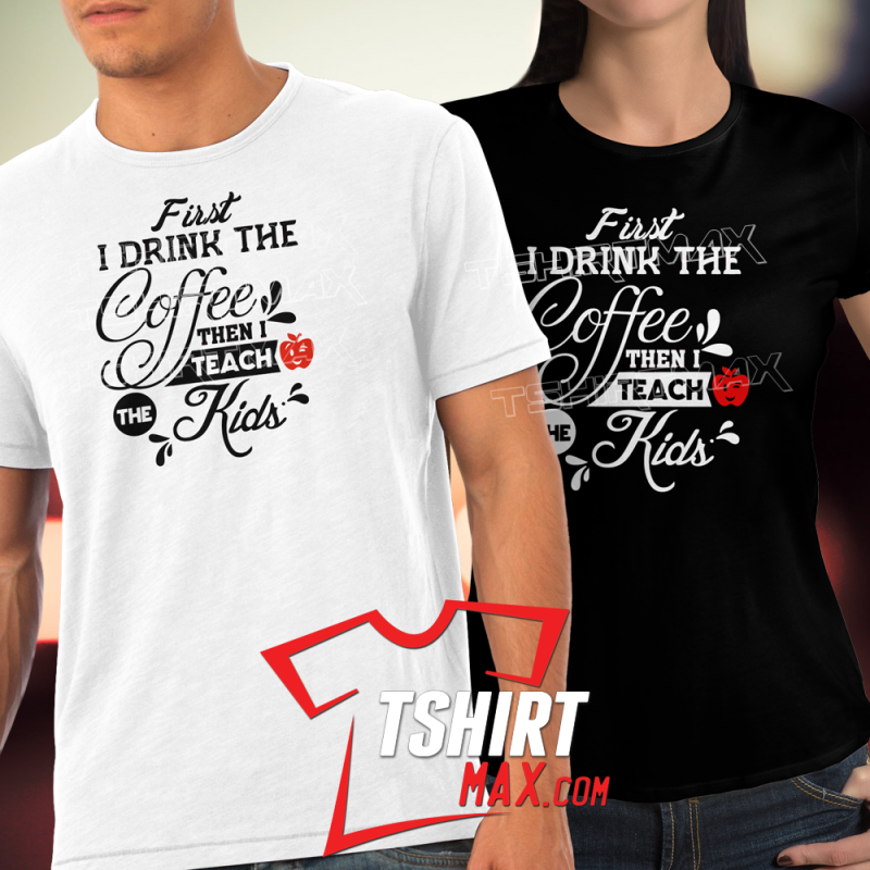 "First I Drink The Coffee Then I Teach The Kids" Diseño original en Blanco/Negro y Rojo - Tshirt Negra/Blanca Next Level 60% / 40% para Chicas y Tshirt marca Jerzees/Gildan para Chicos material 50% algodón y 50% polyester. Ojo CHICAS: las Next Level corren ajustadas.. si quieres que te queden sueltas te recomendamos una talla más.