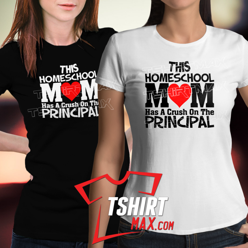 "This Homeschool Mom Has A Crush On The Principal" Diseño original en Blanco/Negro y Rojo - Tshirt Negra/Blanca Next Level 60% / 40% para Chicas y Tshirt marca Jerzees/Gildan para Chicos material 50% algodón y 50% polyester. Ojo CHICAS: las Next Level corren ajustadas.. si quieres que te queden sueltas te recomendamos una talla más.