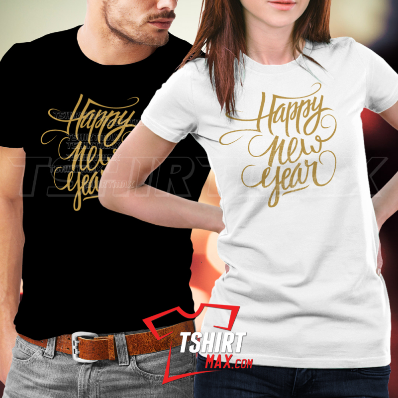 "Happy New Year V1" Diseño original en Oro - Tshirt Negra para chicas Next Level 60% / 40% para Chicas y Tshirt marca Jerzees/Gildan para Chicos material 50% algodón y 50% polyester. Ojo CHICAS: las Next Level corren ajustadas.. si quieres que te queden sueltas te recomendamos una talla más.