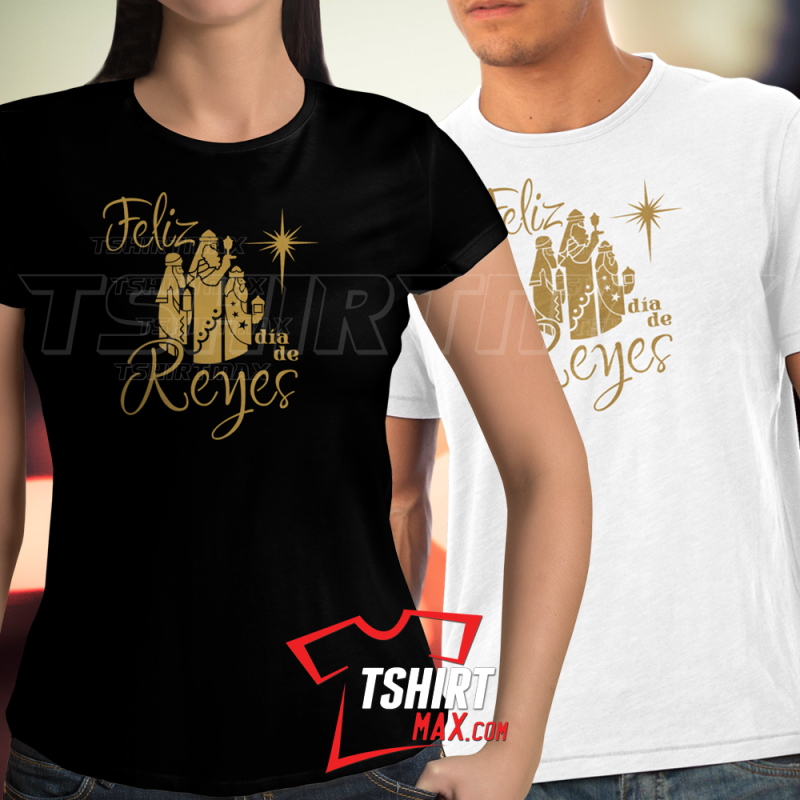 "Feliz Día De Reyes N2" Diseño original en Oro - Tshirt Blanca ó Negra para chicas Next Level 60% / 40% para Chicas y Tshirt marca Jerzees/Gildan para Chicos material 50% algodón y 50% polyester. Ojo CHICAS: las Next Level corren ajustadas.. si quieres que te queden sueltas te recomendamos una talla más.