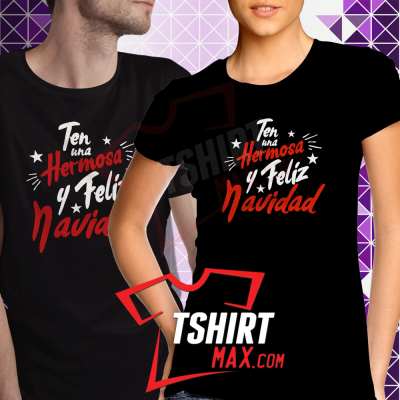 "Ten una hermosa y felíz Navidad" diseño original en Roja y Blanco/Negro - Tshirt Negra Next Level 60% / 40% para Chicas y Tshirt marca Jerzees/Gildan para Chicos material 50% algodón y 50% polyester. Ojo CHICAS: las Next Level corren ajustadas en area de busto y costado..recomendamos una talla más.