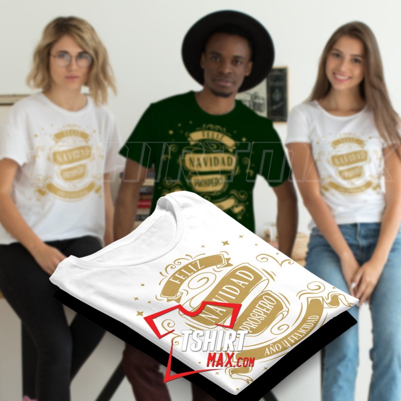 "Feliz Navidad y Prospero Año Nuevo" diseño original en Oro - Tshirt Negra/Blanca  Next Level 60% / 40% para Chicas y Tshirt marca Jerzees/Gildan para Chicos material 50% algodón y 50% polyester. Ojo CHICAS: las Next Level corren ajustadas en area de busto y costado..recomendamos una talla más