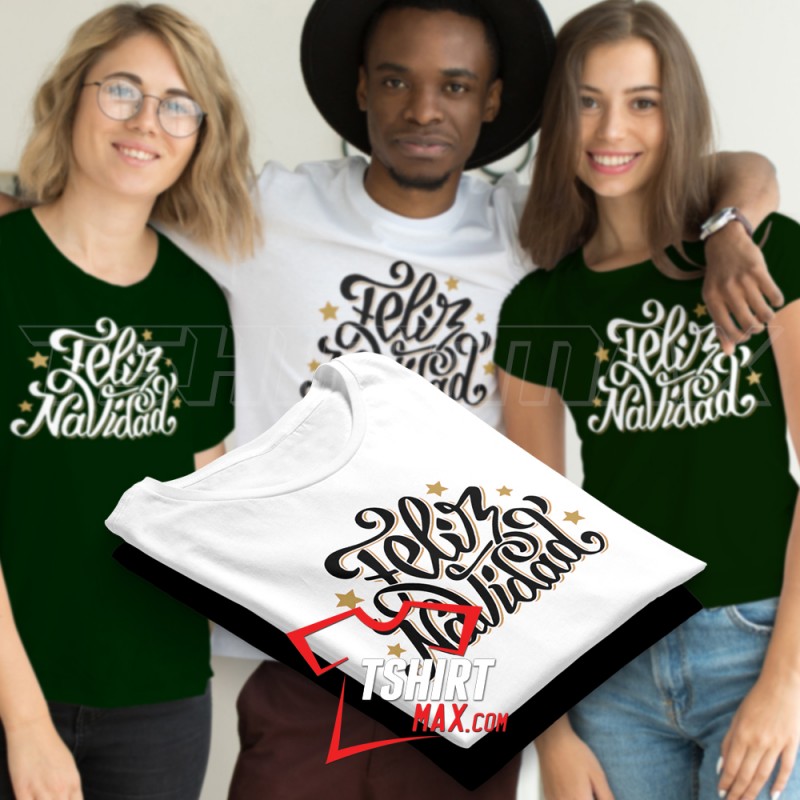 "Feliz Navidad V5" diseño original en Blanco/Negro y Oro - Tshirt Negra/Blanca Next Level 60% / 40% para Chicas y Tshirt marca Jerzees/Gildan para Chicos material 50% algodón y 50% polyester. Ojo CHICAS: las Next Level corren ajustadas en area de busto y costado..recomendamos una talla más.