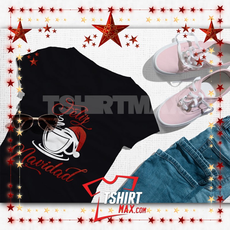 "Feliz Navidad CAFE V1" diseño original en Blanco y Rojo con Brillo (Glitter) ó Blanco y Rojo Sin Brillo - Tshirt Negra/Blanca Next Level 60% / 40% para Chicas y Tshirt marca Jerzees/Gildan para Chicos material 50% algodón y 50% polyester. Ojo CHICAS: las Next Level corren ajustadas en area de busto y costado..recomendamos una talla más.