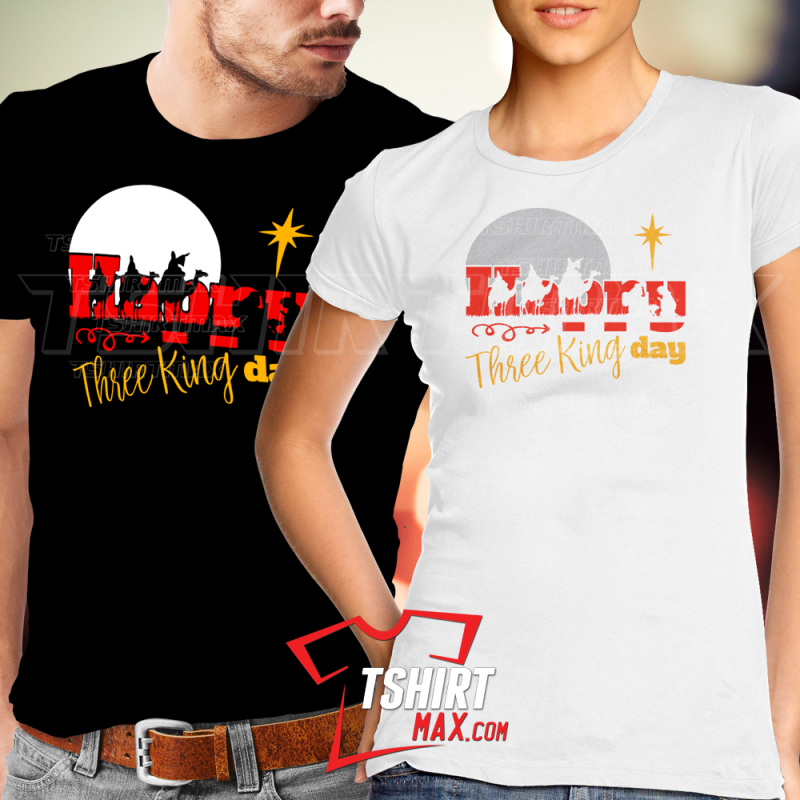 "Happy Three King Day" Diseño original en Blanca/Silver ó Rojo y Amarillo - Tshirt Blanca ó Negra para chicas Next Level 60% / 40% para Chicas y Tshirt marca Jerzees/Gildan para Chicos material 50% algodón y 50% polyester. Ojo CHICAS: las Next Level corren ajustadas.. si quieres que te queden sueltas te recomendamos una talla más.