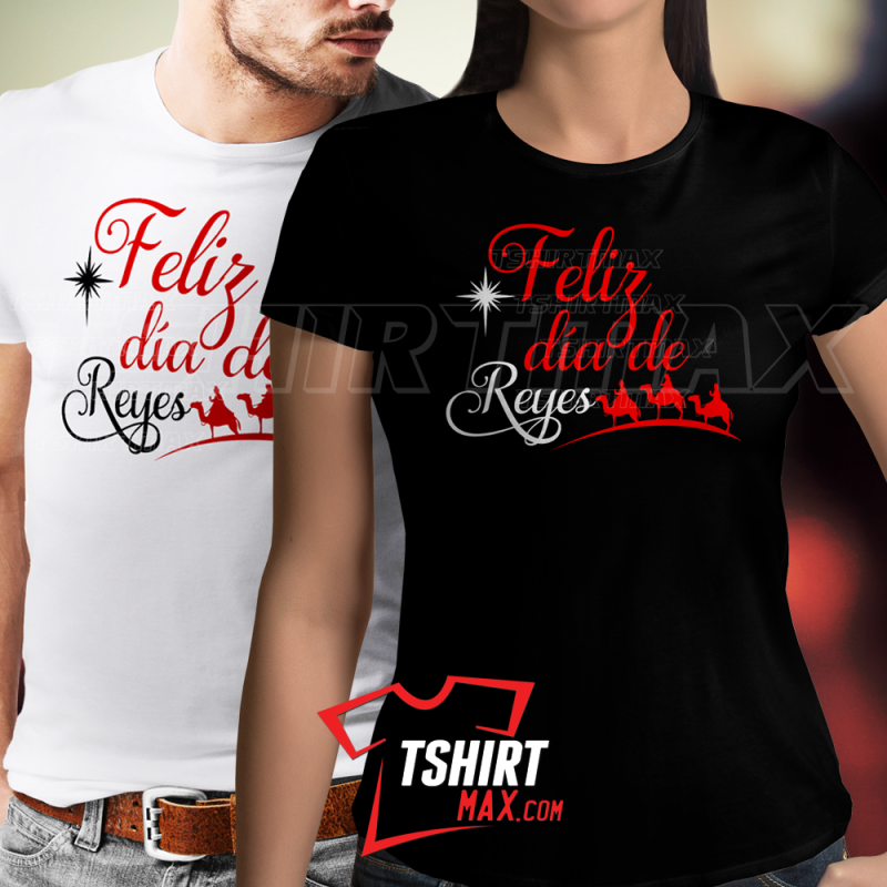 "Feliz Día De Reyes N3" Diseño original en Blanco/Negro y Rojo - Tshirt Blanca ó Negra para chicas Next Level 60% / 40% para Chicas y Tshirt marca Jerzees/Gildan para Chicos material 50% algodón y 50% polyester. Ojo CHICAS: las Next Level corren ajustadas.. si quieres que te queden sueltas te recomendamos una talla más.