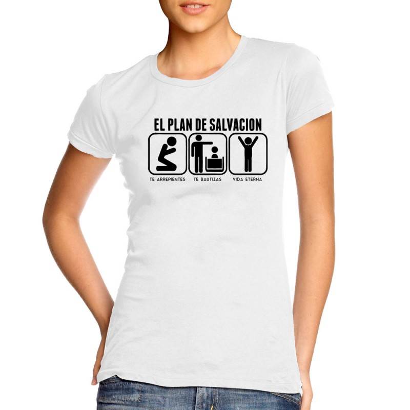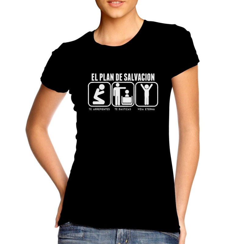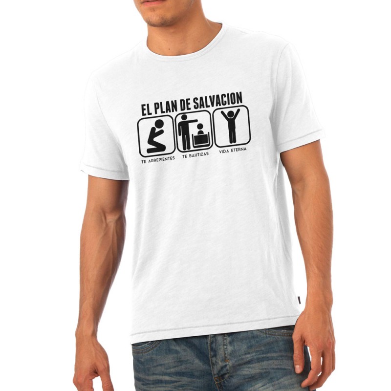"El Plan De Salvación" diseño original en Blanco ó Negro - Tshirt Blanca ó Negra Next Level 60% / 40% para Chicas y Tshirt marca Jerzees/Gildan para Chicos material 50% algodón y 50% poliester. Ojo CHICAS: las Next Level corren ajustadas.. si quieres que te queden sueltas te recomendamos una talla más.